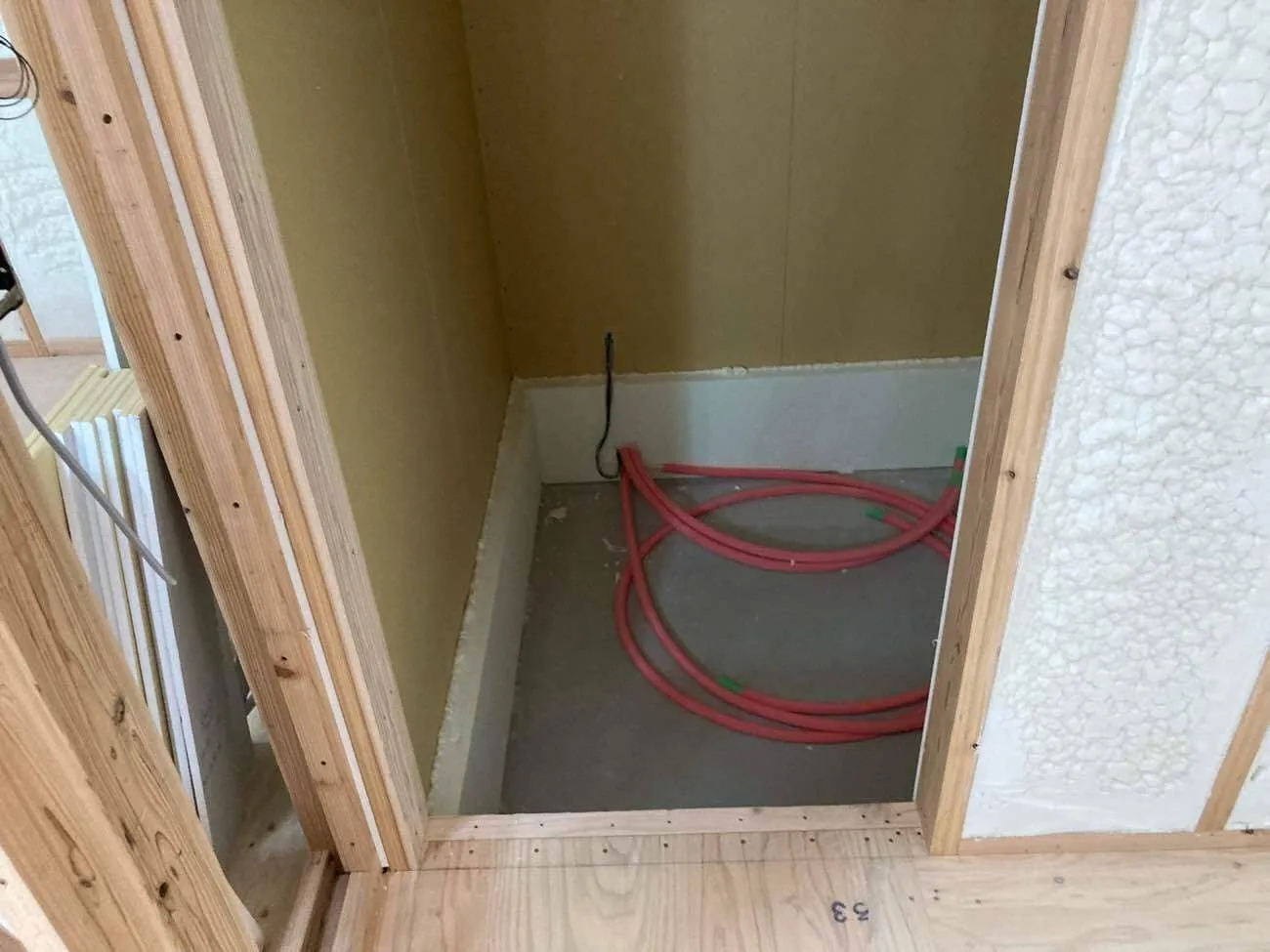 まんぷくハウスでは浴槽の下の基礎の部分をしっかり断熱しております。断熱しないと冷気が浴槽の下に流れ込み、浴槽が冷てしまったり、浴室の床がヒヤッとしてしまいます。同時に家の断熱効果も下がるので徹底的に施工を行っています