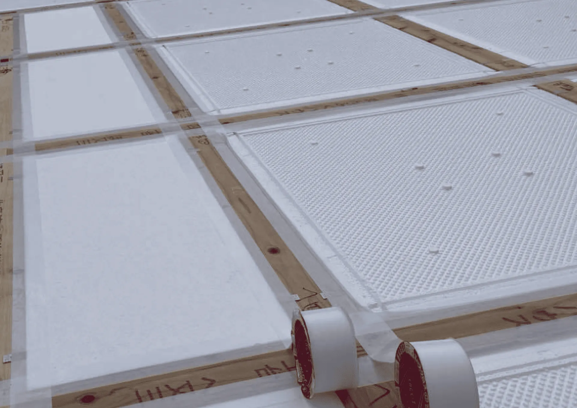 床の断熱工法は床下に断熱材を貼り、床を境に断熱する【床断熱工法】を採用しております。床から断熱することにより、家中の断熱性能を上げ、基礎の中の通気やメンテナンスを確保することが可能になってきます。またシロアリ対策に強く、気密テープを貼って施工していますので、気密性も高く保てます。
