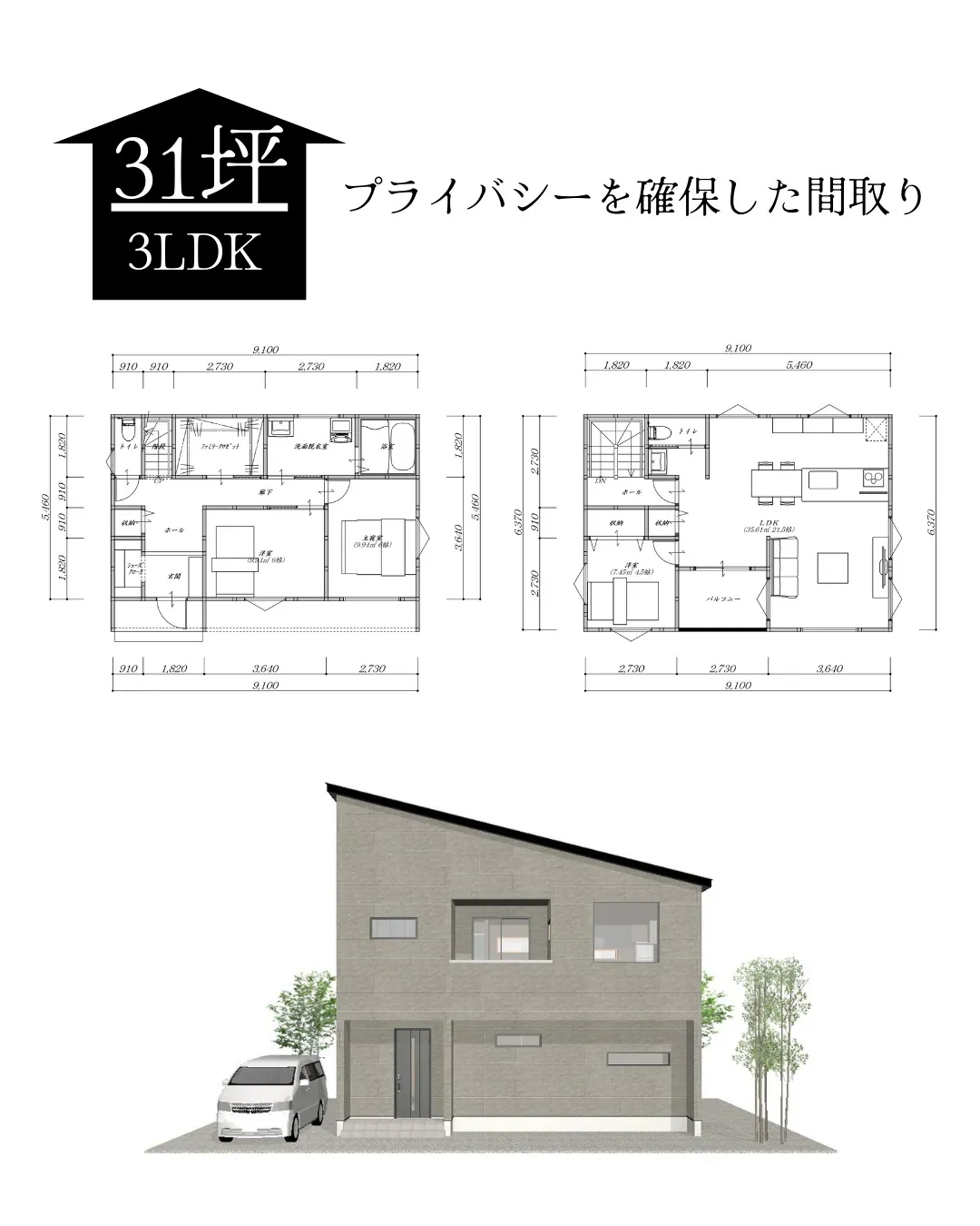 【31坪3LDKのpuraibasi-wo二階建てプラン!】⁡📐【1階】・インナーガレージが設けられているので、雨の日も安心!・玄関ホールには独立洗面台が設けられているので、帰宅後のお手洗いがとても便利◎📐【2階…