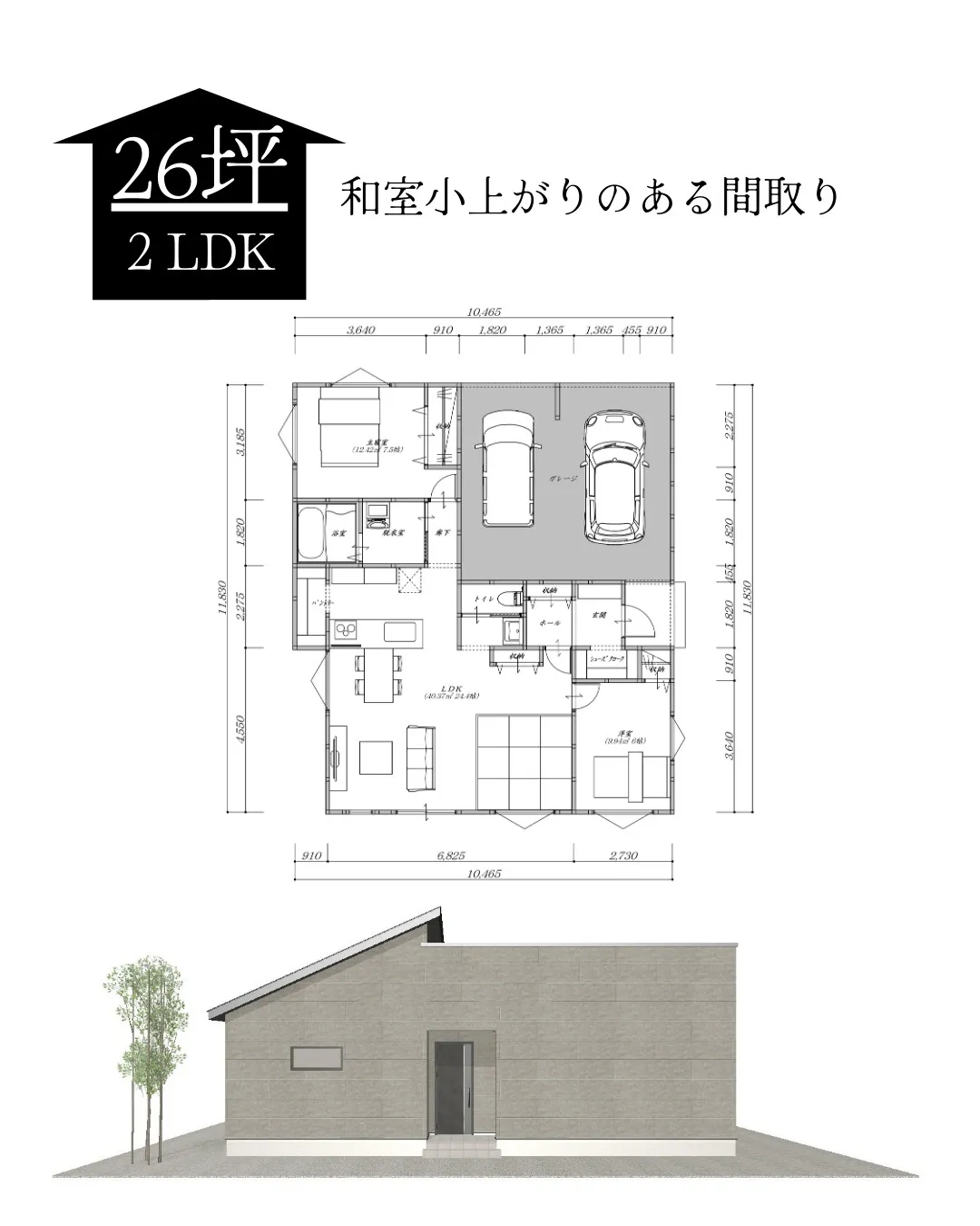 【26坪・2LDKの和室小上がりのある平屋間取り】 【26坪・2LDKの和室小上がりのある平屋間取り】📌Point✔24.4帖のLDKは家族がくつろげる広々空間!✔洋室と主寝室を分けてプライベートも確保✔インナーガレージもあるため雨の日も安心✨✔キッチン横には広々…