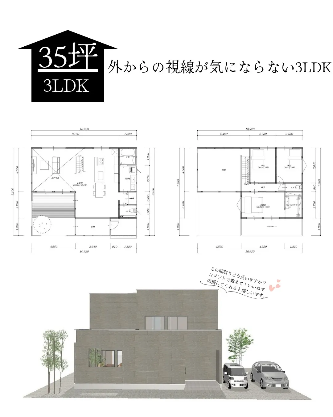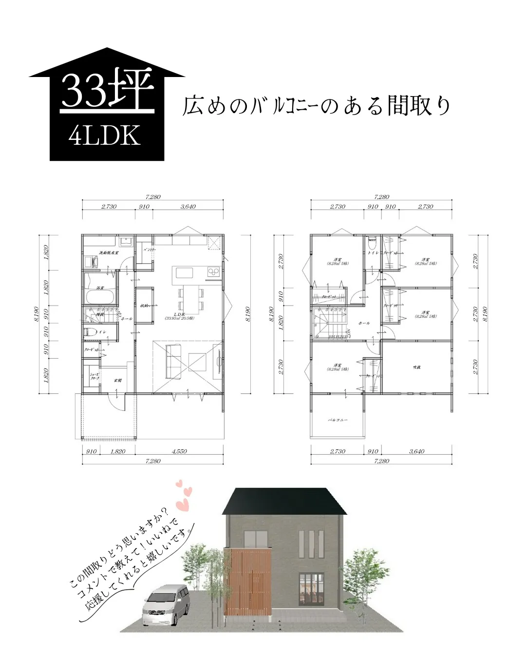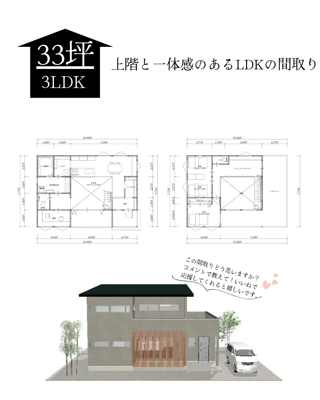 【33坪3LDKの上階と一体感のあるLDKの二階建てプラン!... 【33坪3LDKの上階と一体感のあるLDKの二階建てプラン!】・33.3帖の広々LDKと吹き抜けにより広々空間!・洗面脱衣室・トイレは老後も使えるよう広々設計・様々な用途としても活用できる広々バルコニーも…