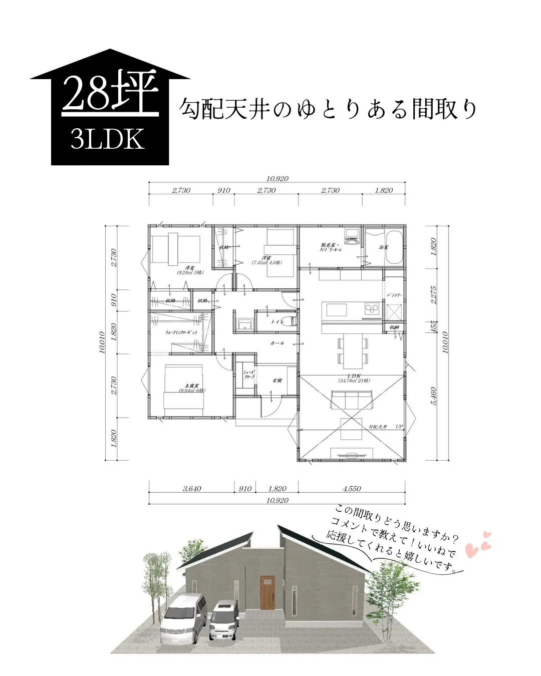 【28坪・3LDKの勾配天井のゆとりある平屋間取り】 【28坪・3LDKの勾配天井のゆとりある平屋間取り】📌Point✔21帖のLDKは家族がくつろげる広々空間!✔洋室と主寝室を分けてプライベートも確保✔パントリー・シューズクローク・ウォークインクローゼットもあ…