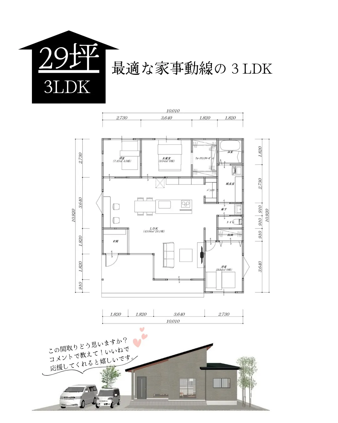 【29坪・3LDKの最適な家事動線の3LDK】 【29坪・3LDKの最適な家事動線の3LDK】📌Point✔26.1帖のLDKは家族がくつろげる広々空間!✔玄関ホールがないため玄関からそのままLDKへ!✔脱衣室では奥様が作業できるカウンターも設けているため家事もしや…