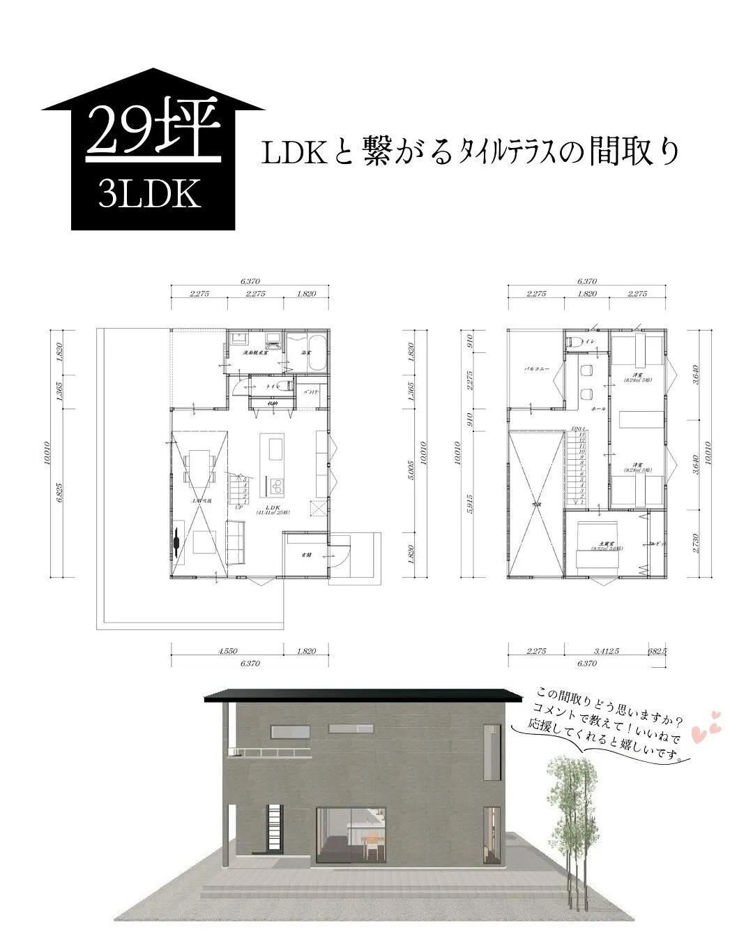 【29坪3LDKのLDKと繋がるタイルテラスの二階建てプラン... 【29坪3LDKのLDKと繋がるタイルテラスの二階建てプラン!】📐【1階】・25帖の広々LDKと吹き抜けにより広々空間!・玄関から直接LDKのため空間が広く、動線が短くなり荷物運びや家事がスムーズに✨📐【2階】…