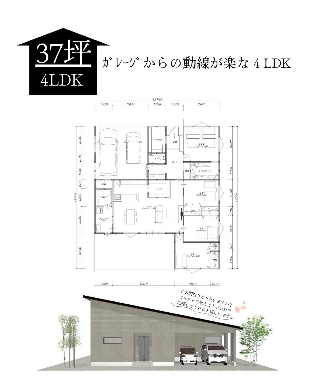 【37坪・4LDKのガレージからの動線が楽な4LDK】 【37坪・4LDKのガレージからの動線が楽な4LDK】📌Point✔21.5帖のLDKは家族がくつろげる広々空間!✔玄関ホールは広々洗面化粧台があるため帰ってきてからのただいま手洗いがとても便利✨✔ウォークインクロー…